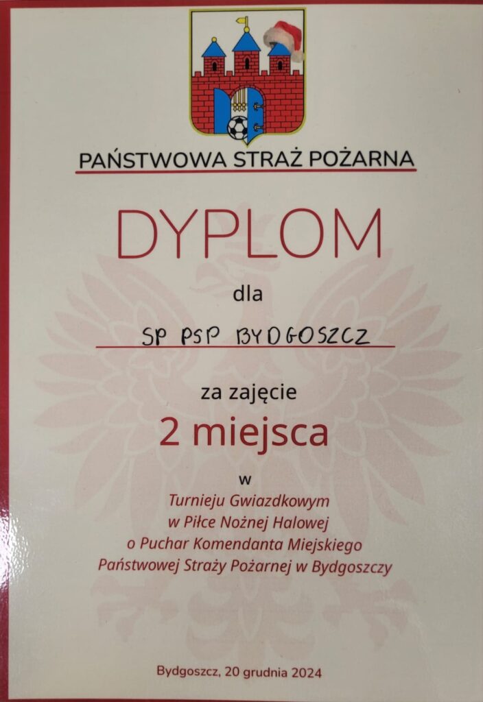 20 grudnia 2024 r. odbył się Turniej Gwiazdkowy o Puchar Komendanta Miejskiego Państwowej Straży Pożarnej w Bydgoszczy w halowej piłce nożnej. Szkoła Podoficerska PSP w Bydgoszczy zmierzyła się z innymi drużynami reprezentowanymi przez każdą Jednostkę Ratowniczo-Gaśniczą oraz Komendę Miejską PSP w Bydgoszczy. Rozgrywane mecze były emocjonujące, nie brakowało spektakularnych akcji i sportowej rywalizacji, która zaowocowała zajęciem drugiego miejsca. Dziękujemy naszej drużynie w składzie: