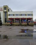 Cztery zastępy strażaków stoją na baczność przed wozami strażackimi, na tle garażu bojowego Szkoły, dowódcy zastępów oddają honor